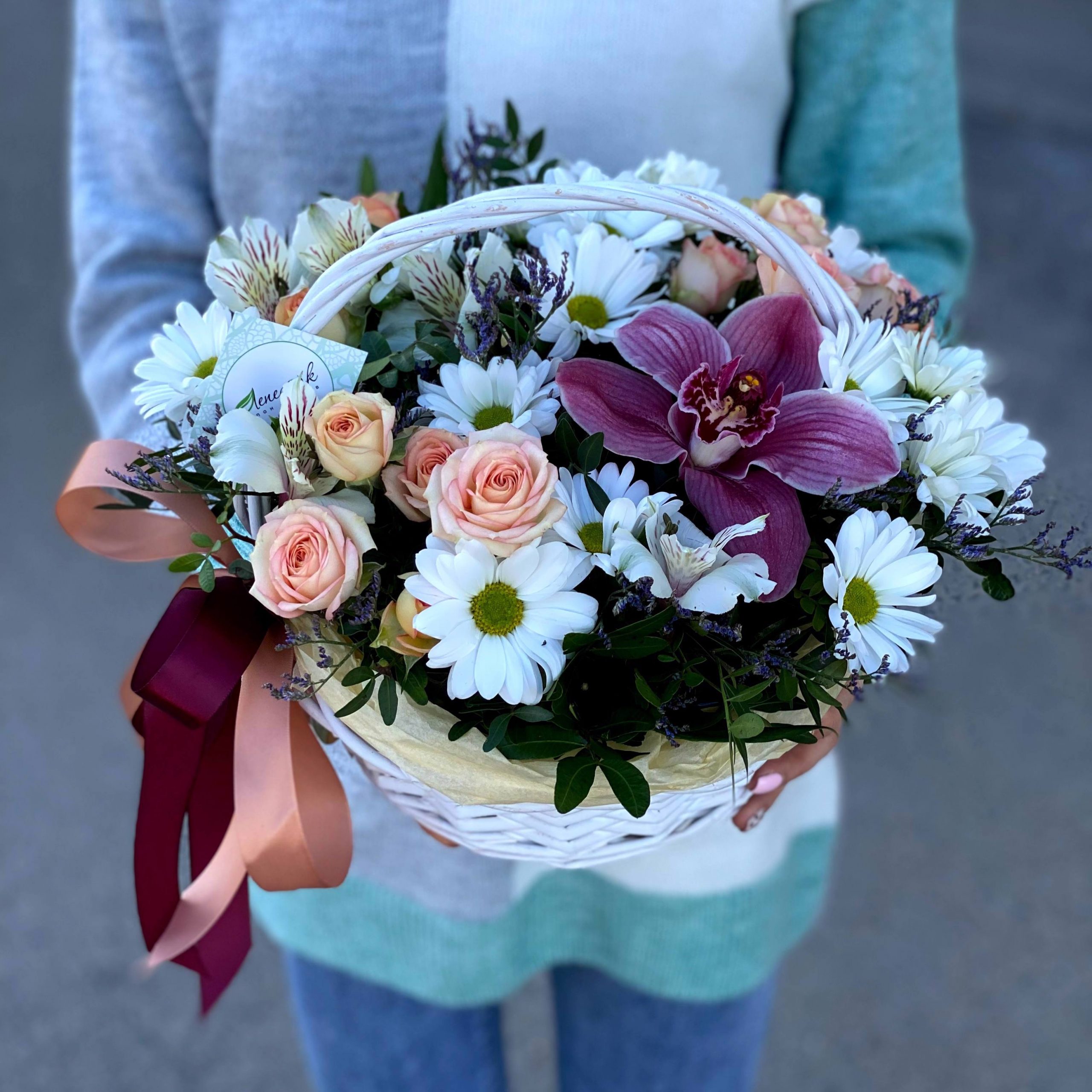Корзинка их хризантем, кустовых роз и орхидеи в Богдановиче